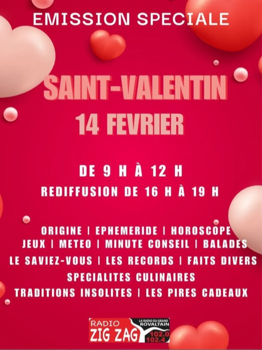 Au programme : Les origines de la Saint Valentin, éphéméride, horoscope, jeux, météo, la minute conseil, des idées de balades locales à faire en amoureux, le saviez-vous ?, les records, quelques faits divers, quelques spécialités culinaires mondiales, les traditions insolites et bien évidement les pires cadeaux à offrir !