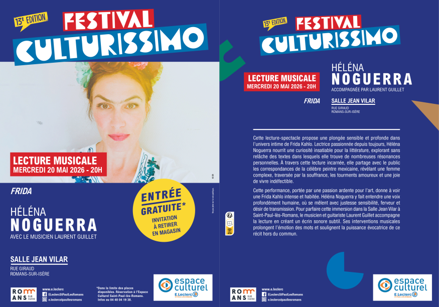 Rendez-vous le mercredi 20 mai à 20h pour 13e édition du Festival Culturissimo à la Salle Jean Vilar, Rue Giraud à Romans-sur-Isère, avec l’artiste Héléna Noguerra pour une lecture musicale exceptionnelle intitulée "Frida".