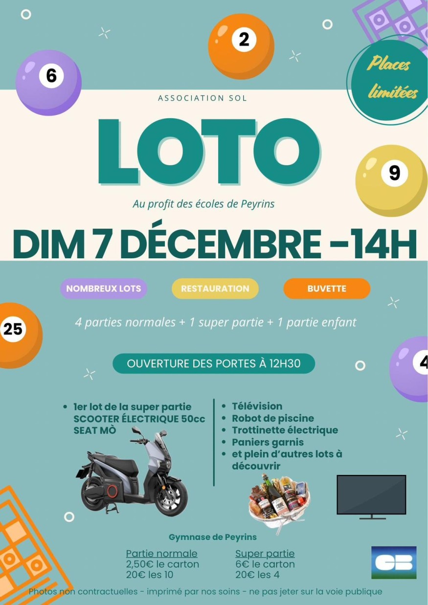 Dimanche 7 décembre à 14h super loto des écoles de Peyrins organisé par l'association des parents d'élèves au gymnase de Peyrins !