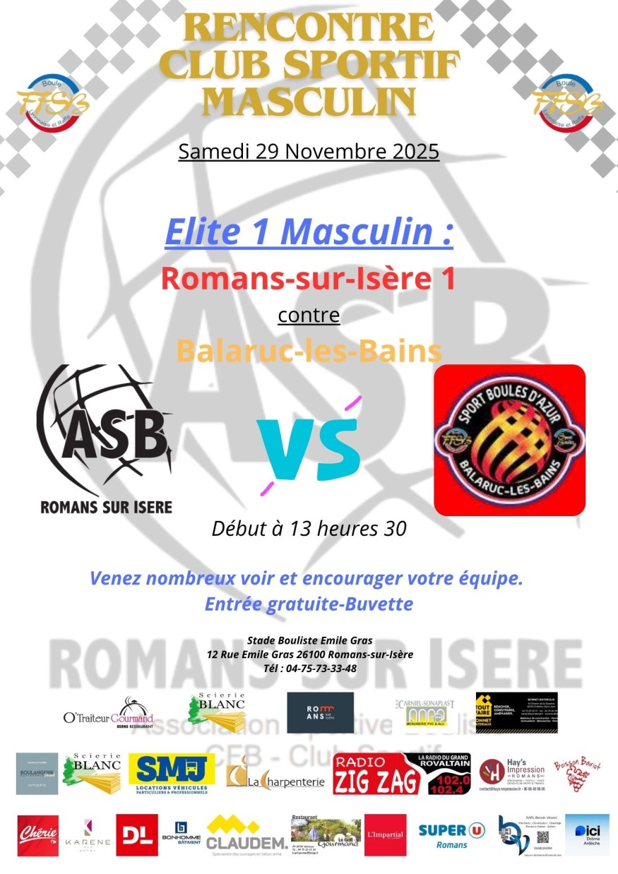 Rencontre Club Sportif Masculin de Boulles le samedi 29 novembre à partir de 13 h 30 au stade Bouliste EmileGras à Romans sur Isère opposant en :