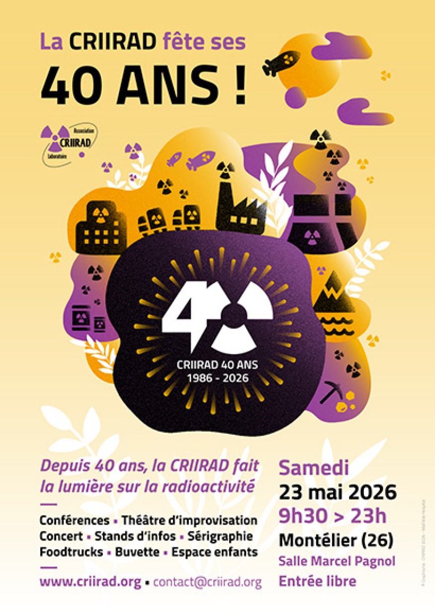 À l’occasion de ses 40 ans, la CRIIRAD donne rendez-vous au public le samedi 23 mai 2026 à Montélier (26), à la salle Marcel Pagnol, pour une journée de rencontres, de conférences et d’animations ouverte à toutes et tous.