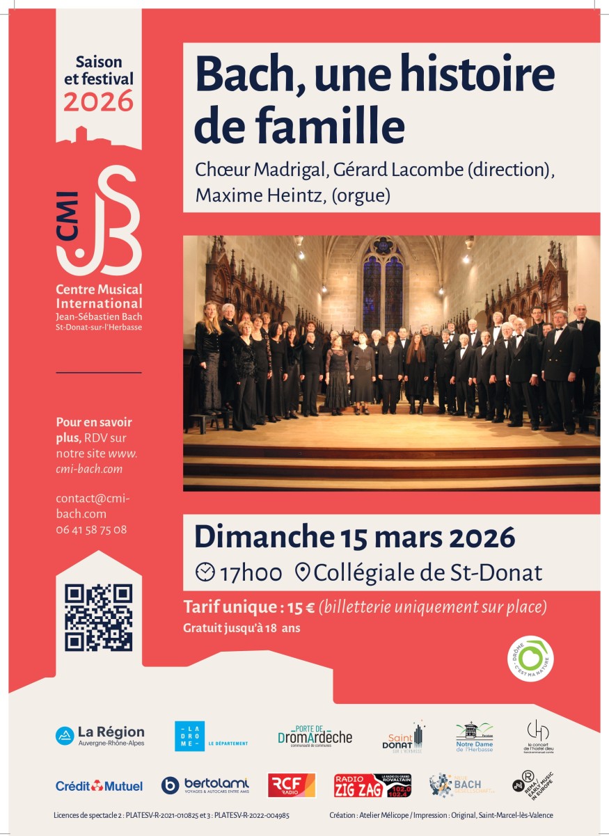Rendez-vous le dimanche 15 Mars à 17h à la collègiale de Saint Donnat pour un concert Bach en famille organisé par le CMI saint donnat avec Chœur Madrigal, Gérard Lacombe (direction), et Maxime Heintz (orgue)