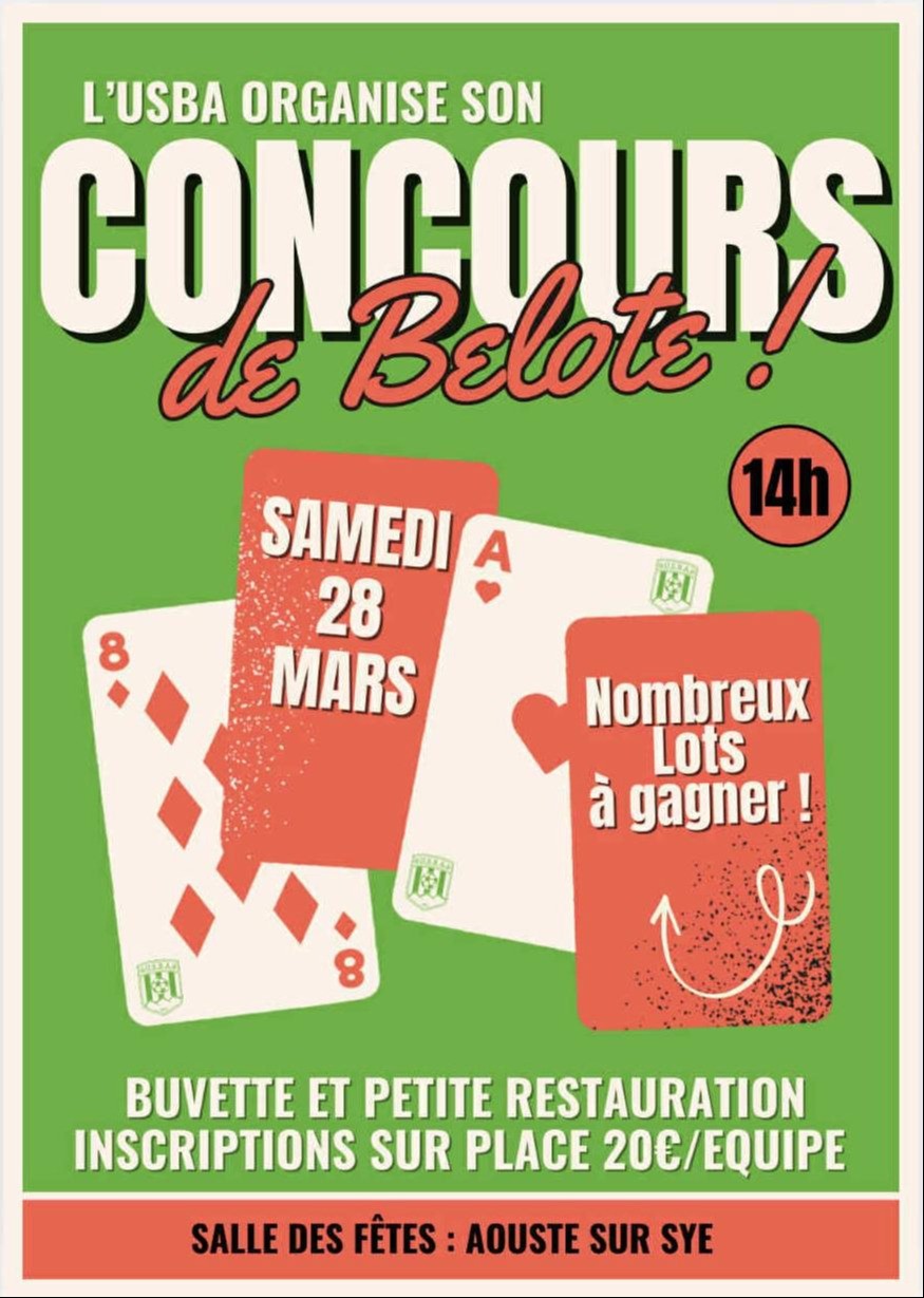 L'USBA organise un Concours de belote le 28 mars dés 14h a la salle des fetes de Aouste S/Sye,buvette et petite restauration sur places
