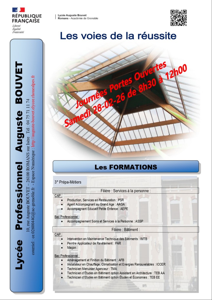 Rendez-vous au portes ouvertes du lycée Auguste Bouvet de 8h30 a 12h au 10 rue Auguste Bouvet a romans s/Isere